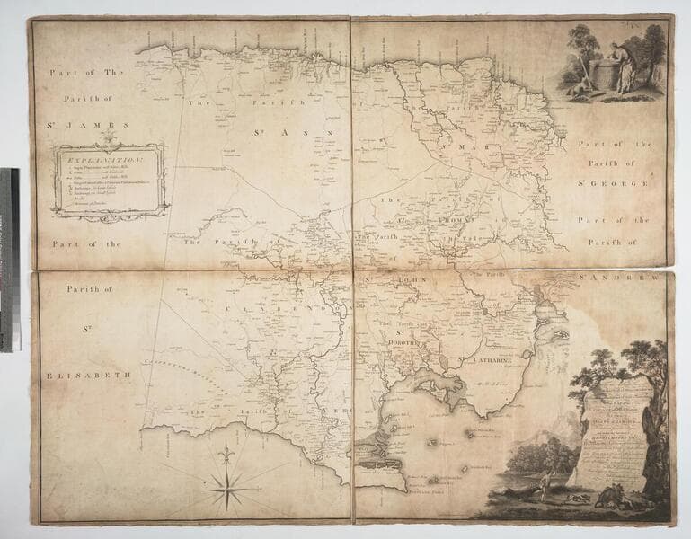 Cartouche: Elaborate farming scene; Stair steps around scale. . Relief: no. Graphic Scale: Miles. Projection: Plane. Printing Process: Copper engraving. Other Features: Cartouche. Verso Text: Label with MS note: Parishes of St. James Westmoreland Hanover St. Elizabeth .