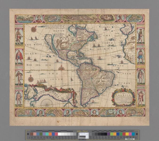 A new and most exact map of America described by N.I. Vischer and don into English enlarged and corrected acording to I. Bleau and others with the habits of ye people & ye manner of ye Cheife Sitties ye like never before. London. Printed colloured and are to be sold by John Overton at ye White Horse neere the Fountaine Tavern Without Newgate