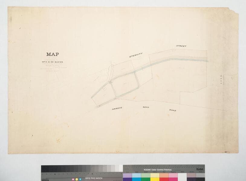 Land belonging to Mrs. A[rcadia] B[andini] de Baker [Eternity St. to Arroyo Seco Road west of the S.P.R.R. depot grounds, showing structures (including the mill) and surface detail]