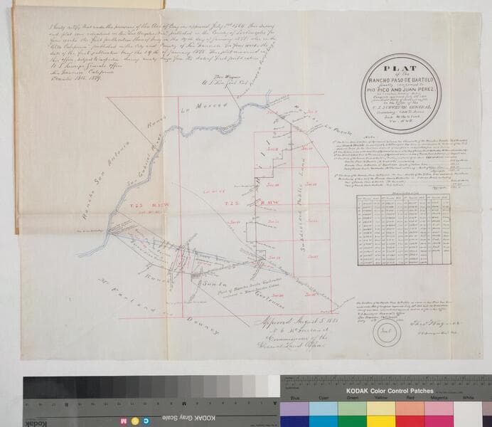 Plat of the Rancho Paso de Bartolo.; finally confirmed to Pio Pico and Juan Perez