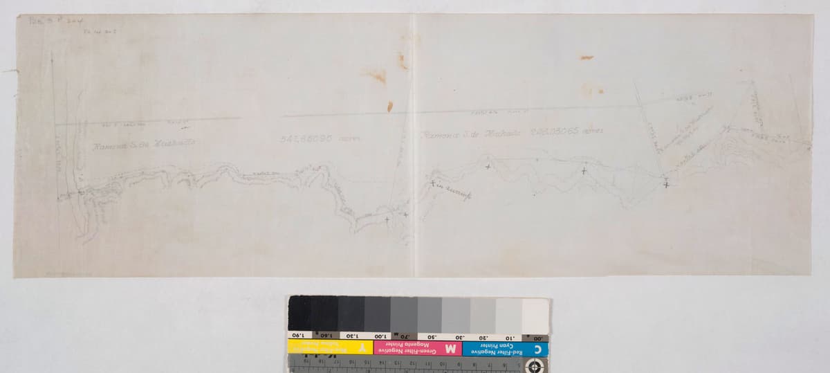 Rancho El Rincon, Vicente Hill land Bound volume: Rancho La Sierra, Partition 1876-1877. Colored pencil; surface details; showing courses, distances, acreage; calculations & notations, parcel owners; writing on verso. Title supplied by cataloger.