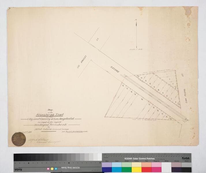 Along Second St., San Pedro to Los Angeles St., subdivision with Electric Street Railway lines down Second; courses, distances; color highlighting; structures; color fill on some lots; surveyed at the request of Regina Weinshenk.. Paper watermark: Southworth’s 1882 Linen Bank. [See also Maps 635, 724, 729]. Alt. title supplied by cataloger.