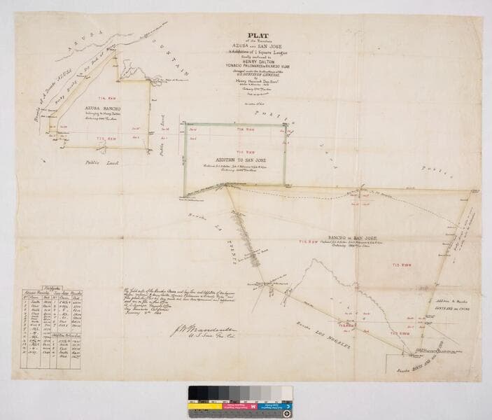Plat of the Ranchos Azusa and San José and Additions of 1 Square League finally confirmed to Henry Dalton, Ygnacio Palomares & Ricardo Vijar