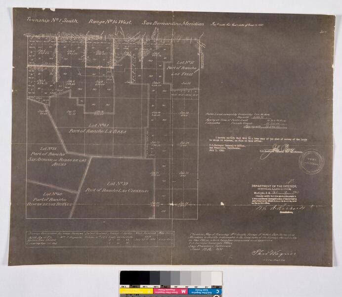 Rancho La Brea. Featuring sections 7-9; Lot No. 11 Rancho La Brea, No. 38 Rancho San Antonio or Rodeo de las Aguas. Title supplied by cataloger.