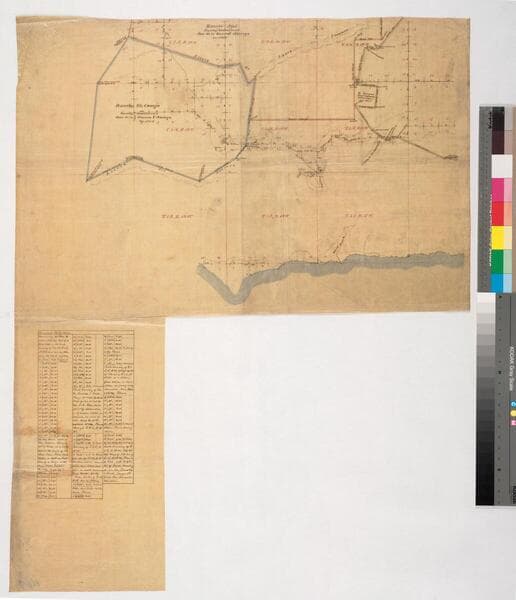 Bordered by ranchos El Cajon de San Juan, Cajon de Santa Ana, Bolsas, San Joaquin, and the Pacific Ocean. Original survey: 1857 Nov & Dec.; copy confirmed by J. W. Mandeville to Bernardo Yorba et al.. Inset with table of boundary data. Color highlights, detailed hachures, structures, water bodies including Santa Ana River, structures, rugged mountains.