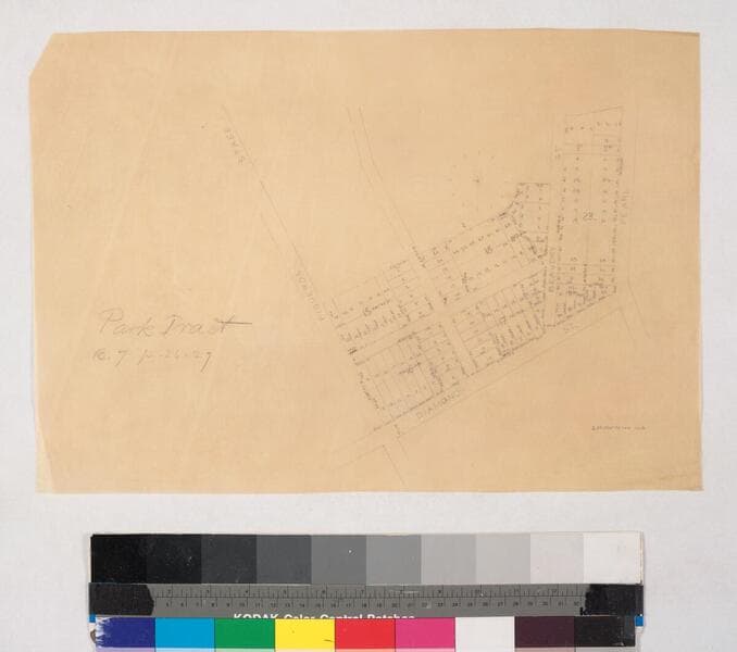 belonging to Andrew Glassell, Esq., with Block 16, Park Tract, Diamond St. from Figueroa to Canal St.; colored inks, courses, distances; block & parcel numbers; shows part of Park Tract. Paper watermark: Royal Linen Ledger. Alt title supplied by cataloger.