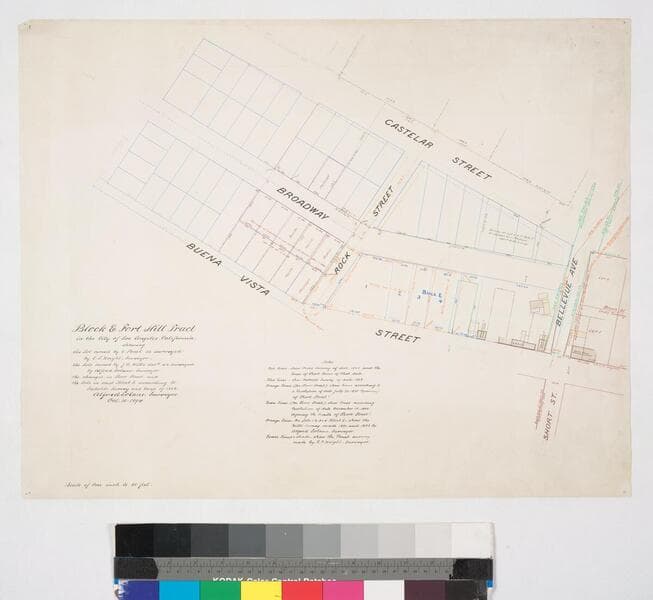 Block & Fort Hill Tract [Castelar to Buena Vista St., Bellevue (Short St.) Ave. to Sand St., showing structures and names of some lot owners, with notes]