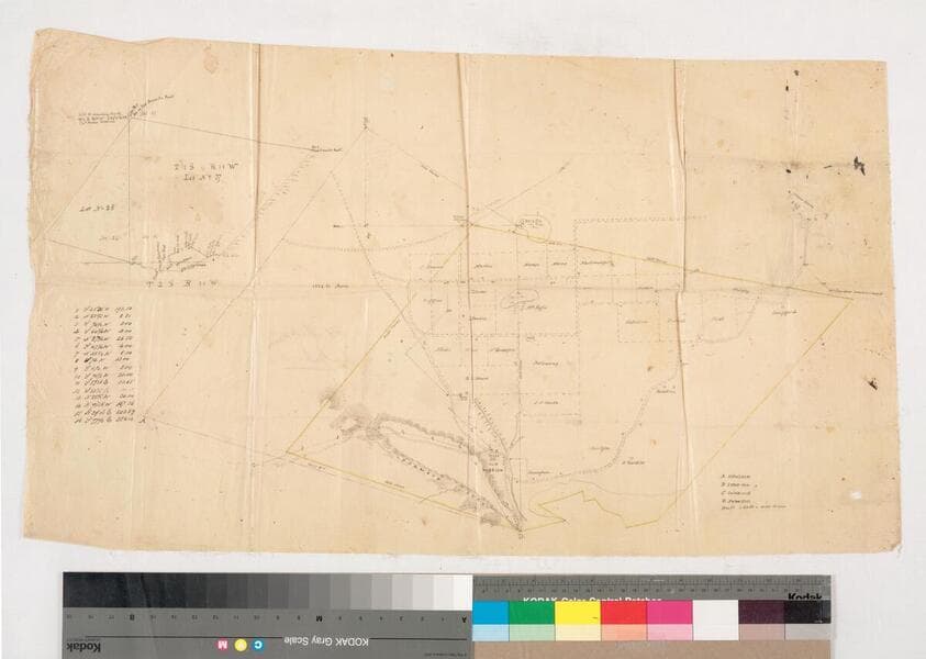 Sierra Madre or San Gabriel Mtns Color highlighting ; featuring parcel owners, township & section numbers, stations, courses, distances, acreage, with two tables of boundary data ; minor surface detail. Alt. title supplied by cataloger.
