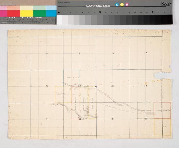 Grid of parcels on northeast boundary highlighted in color with land owners attributed. Title supplied by cataloger.