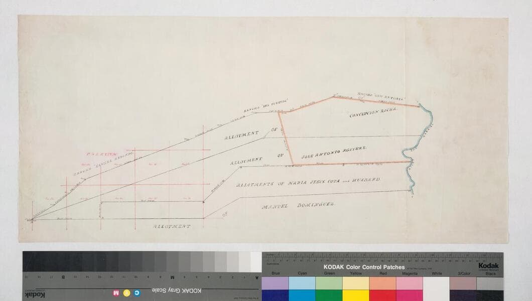 Rancho San Pedro Copied from the original by A. Solano Pencil annotations, calculations Parcel owners and distances, coordinates indicated; one red line indicating old fence