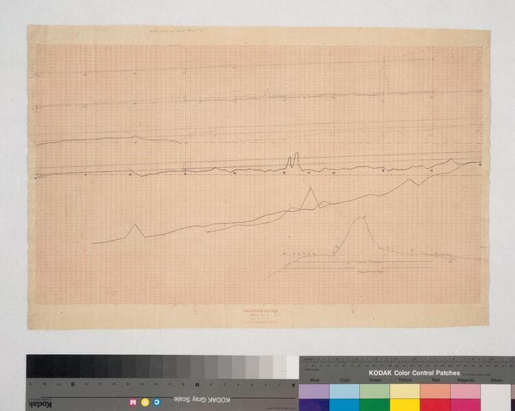 Rancho San Pedro. Profile of a level line run from Wilmington to Camp Drum and thence to a point on the San Gabriel River about 8 miles from camp, Together with a profile of the line run from Camp Drum to the little falls on the San Gabriel River about a mile from its mouth. Verso of larger sheet: Title and sketch map ; in pencil with hachures & coordinates (8 1/2 x 19 in.); two pieces originally glued together. Title supplied by cataloger.