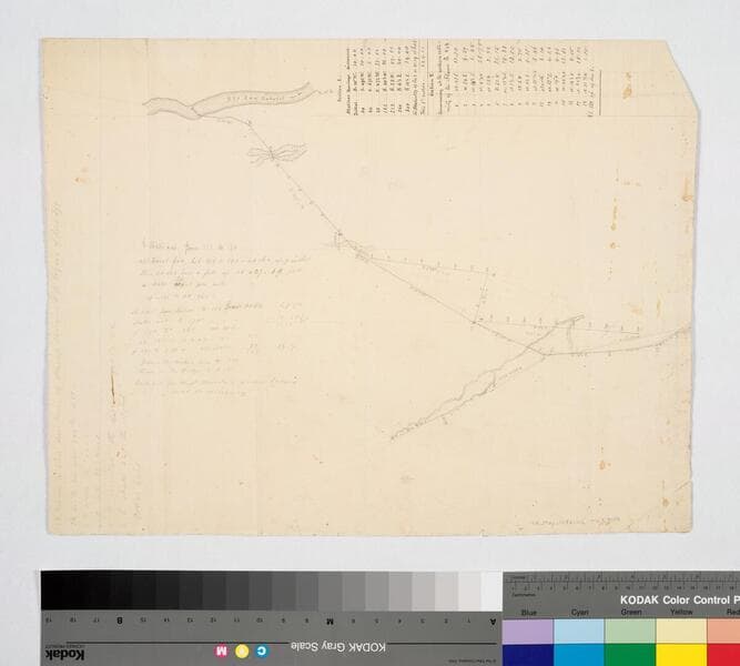 Rancho San Pedro. Ditch & flume sketch maps. Larger sheet recto: inset of 2 tables with stations, bearings, distances; notations on stakes & distances; features Rio San Gabriel and aqueduct details; verso - sketch with series of coordinates. Smaller, irregular sheet, recto only: features include Rio San Gabriel, 1st section ditch, 2nd section ditch & flume, halfway house branch; ; calculations; title on verso. Title supplied by cataloger.