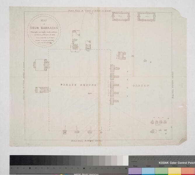 Rancho San Pedro parade ground, garden, picket fences indicated; structures include stables, offices, quarters, guard house, laundries Var. 13° 30' East