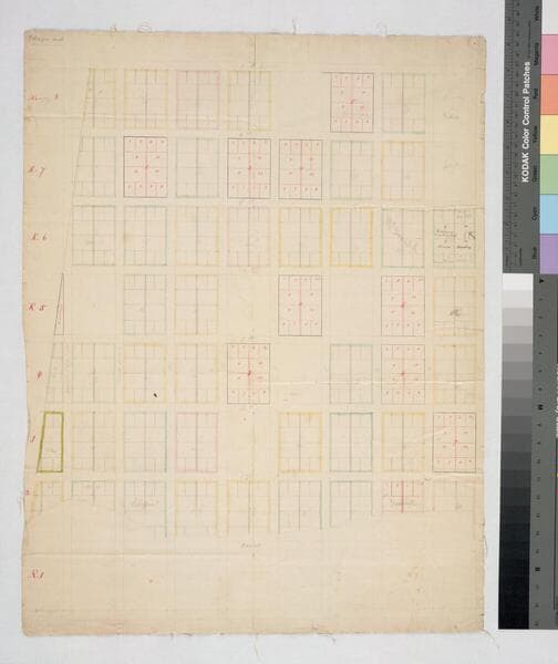 Rancho San Pedro. Water color highlights; center section has the most detail with parcel owners, streets, some structures. Title supplied by cataloger.