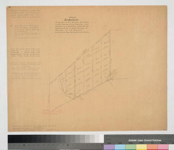 Rancho San Pedro. Primarily parcels with numbers & acreage; few hachures & structures indicated. In Superior Court of L.A. County case No. 939 I. W. Hellman vs. J. G. Downey & Merchants Exchange Bank, partition of land of Rancho San Pedro allotment to Hellman of a tract of 815.46 acres named "Highland". Pencil notes & calculations. Streets includes Forest, Cedar, Oak, Pacific, Wilmington Avenue; Compton & Cerritos county road. Title supplied by cataloger.