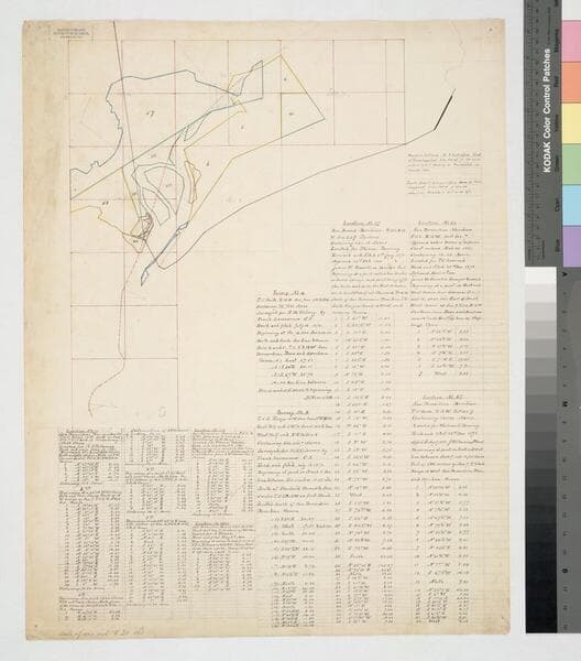 Showing courses, distances, parcel owners with tables of courses & distances. Three pages later: sketch map of Pallaveno's parcels with courses & distances. Title supplied by cataloger.
