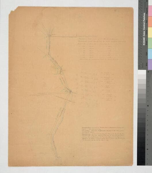Rancho San Pedro. Three colored lines along San Gabriel River and key to their meanings. Pencil annotations & calculations; faded blue writing on verso. Title supplied by cataloger.