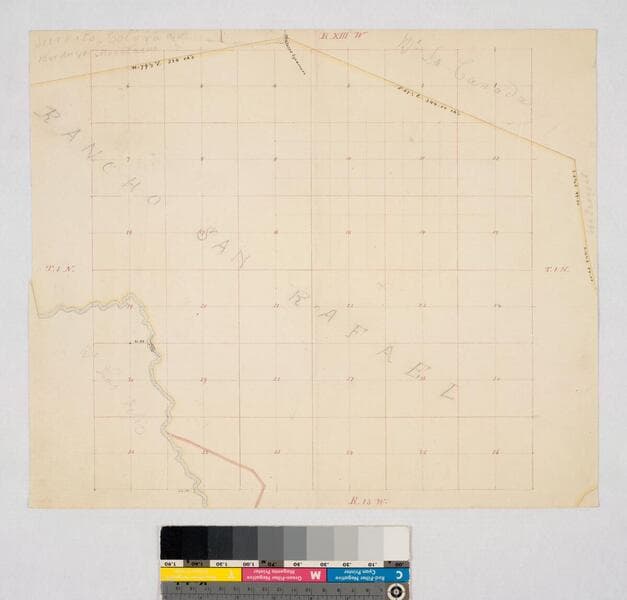 Bordered by Ranchos Huerta de Cuati, San Rafael, "high rugged hills" (Rancho Santa Anita not indicated). Printed township grid with colored borders, hachures and coordinates. Cañon of the Rio Hondo featured. . Alt title supplied by cataloger.
