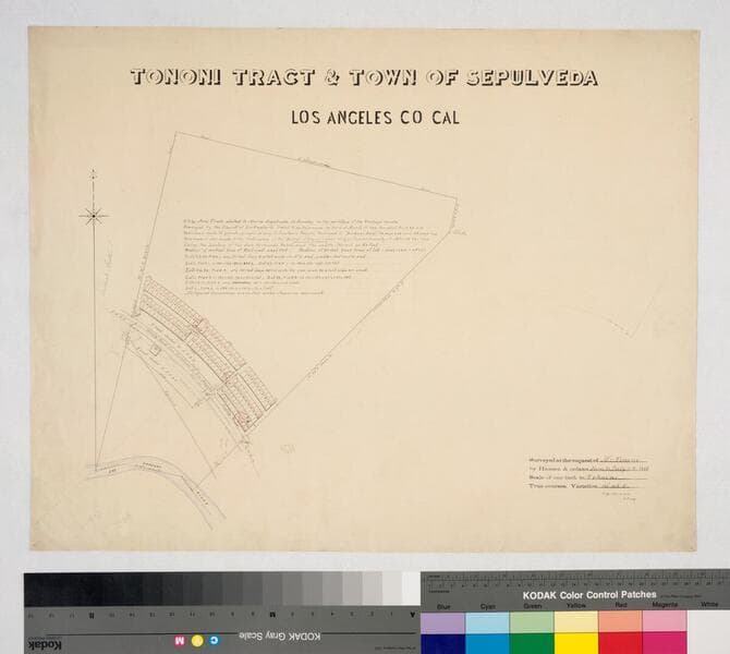Bordered by Scott Burbank Tract, Los Angeles River. Original survey September 20 & 24th on request of Fernando Sepulveda & Tomas Sanchez by G. Hansen & L. Seebold. Detailed hachures, color highlights; structures and parcel owners [including Hansen] indicated. Detailed notations on survey. Copy by Schiffers. Alt title supplied by cataloger.