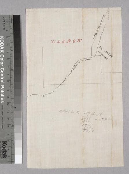 Northwest corner of Jefferson & Main St., with part of sec. 8, T.2S. R.13W. S.B.M., straddling Patent Boundary line. Notation: "Orangery of Wm. B. Lawlor, Lot 7 Bl 2 Hancock's survey. Pencil annotations & calculations. [see also Map 490: Briswalter Survey of January 26, 1880]. Alt title supplied by cataloger.