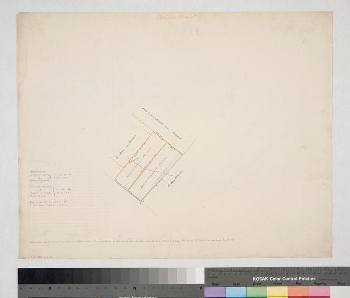 Lot on Negro Alley; shows structures, neighboring parcel owners: Capt. A Bell, Abel Stearns, Sanchez; bearings. Verso: "A.F. Coronel". Alt title supplied by cataloger.