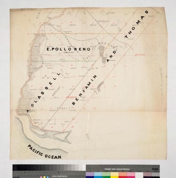 Parcel owners include Peralta-Yorba, Trinidad Peralta de Marquez, Paula Peralta. Detailed subdivision in middle. Detailed hachures, colored highlights, structures, topographical features, vegetation.
