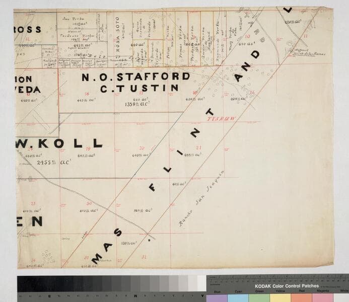 Bordered by Rancho Las Bolsas to the west. Parcel owners include James McFadden, F. W. Koll, Asencion Sepulveda, Jacob Ross. Detailed hachures, colored highlights, structures, topographical features, vegetation.