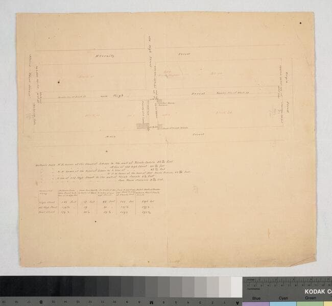 Between High and Virgin St., shows Upper Main Street; with frontages, structures, lot owners; color highlighting, courses, distances. Title supplied by cataloger.