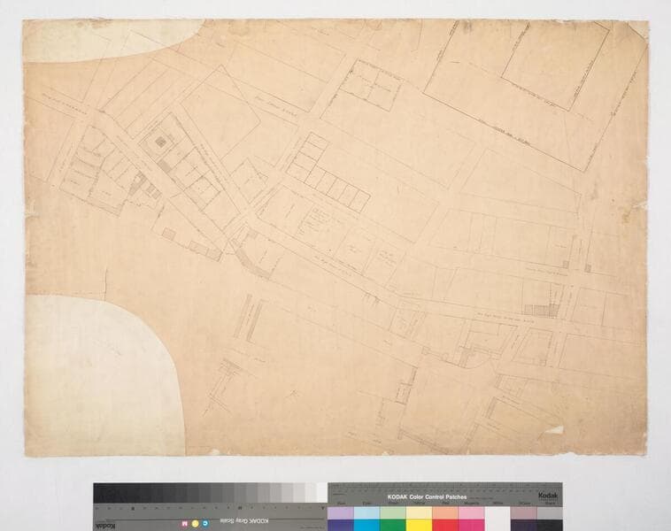 Near Macy St. to Commercial St., Olivera/Sanchez St. and Plaza to Alameda St. and Negro Alley, showing structures, lot owners around Plaza & Negro Alley; courses, distances. Verso: Los Angeles Extension & Negro Alley 1888. Alt title supplied by cataloger.