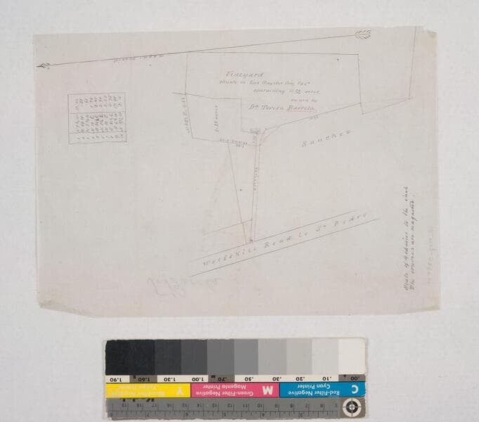 [See also Map 321: Reyes parcels on Old Main St.]. Bearings, distances, parcel owners and title transfer histories; pencil annotations, calculations. Lane from Main Street to Wolfskill Road. Title supplied by cataloger.