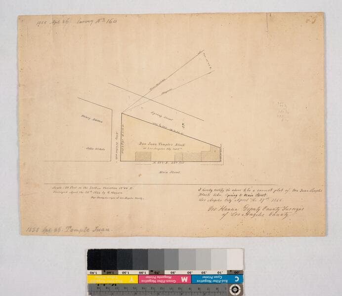 Ord's Survey, delineated from deeds on file, with list of deed transfers; color highlighting; lot dimensions. Third to Fourth St., Main to Spring St., showing structures and lot owners; color highlighting; lot dimensions. Survey requested by G.D. Rowan. Embossed mark on paper: "Duplex.". Alt title supplied by cataloger.