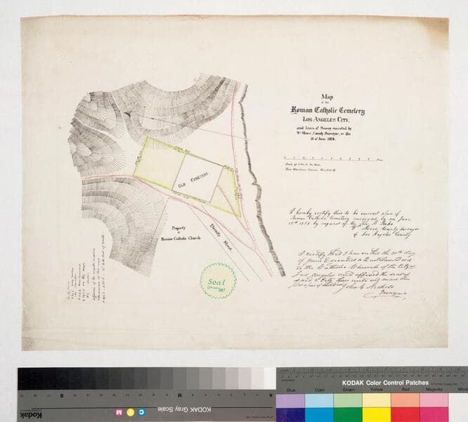 Structures and surface detail: hachures, color highlighting; pencil calculations. Quit claim deed by Mayor Jose Mascarel ; (1865-1866) and other title history. Alt title supplied by cataloger.