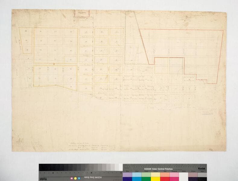 House lots between First to Fourth St. from Main to Hill St., with structures, owners' names; color highlighting, pencil annotations, bearings & distances. Verso: "Ord's Survey houselots betw. 1st & 4th Street. Title supplied by cataloger.