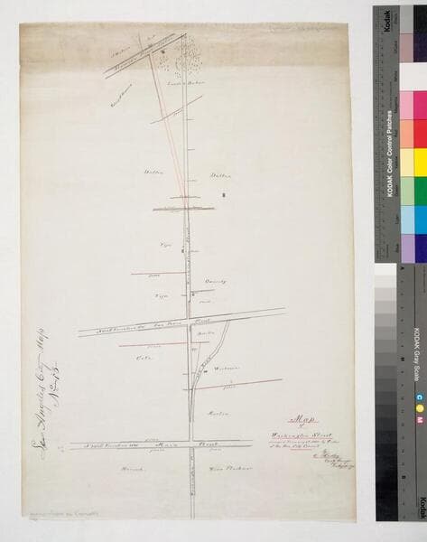 Map of Washington Street (Los Angeles City Map No. 13) [Main St. to Alameda St., showing parcel owners, structures, and some surface detail]
