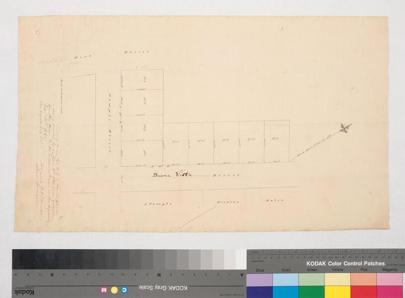 New High to Buena Vista St., north from Temple St., showing structures, lot owners [no one named Eaton]. Red & black ink with color highlights; bearings & distances. Alt title supplied by cataloger.