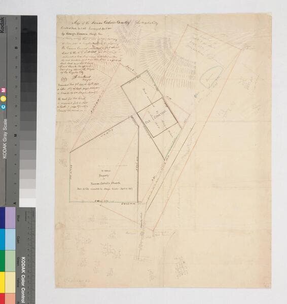 At end of Eternity St., dense hachures, color highlights; road to the Arroyo Seco shown; seal placement indicated; certified by Mayor John G. Nichols (1852-1853; 1856-1858); surveyed requested by Rev. B. Raho. Alt title supplied by cataloger.