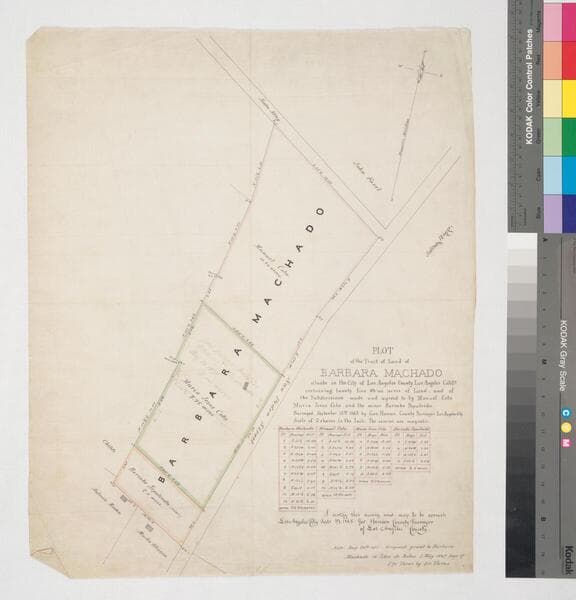 Plot of the Tract of Land of Barbara Machado... containing twenty five 89/100 acres of Land; and of the Subdivisions made and agreed to by Manuel Cota Maria Jesus Cota and the minor Bersabe Sepulveda [west side of San Pedro St. south of Soda Alley, with field notes and showing structures]