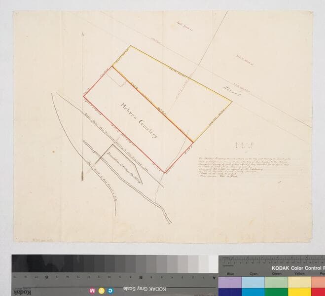 Copy of a plot of a survey executed July 12, 1854, certified by Hansen. On road from San Fernando to Los Angeles, with seal of "Corporation of the City of Los Angeles". South of road: Foundation of College Building along river. Alt title supplied by cataloger.