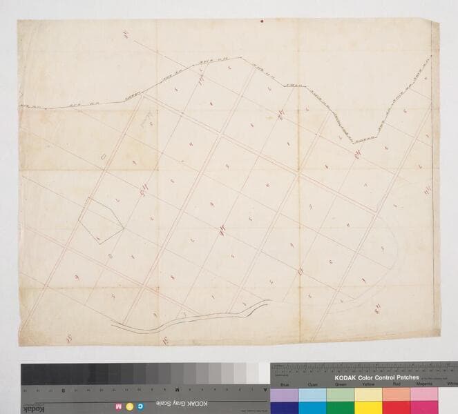 Numbered lots, some owners, Fourth to Eighth St., Main to Grasshopper St.. Verso: Ords Survey, House lots betw. 4th & 6th Street. Red & black ink. Alt. title supplied by cataloger.