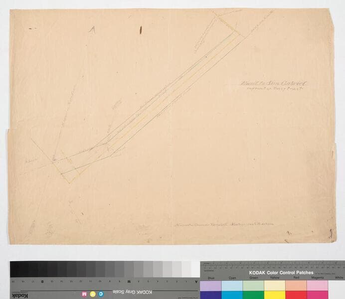 Proposed Mission [?] St. right of way through property of Mariano Ruiz [?]. Two structures, fence indicated; color highlighting; bearings, distances. Variant draft: no title, two sheets glued together; no structures indicated. See also Map 541 [these two maps may belong there]. Alt. title supplied by cataloger.