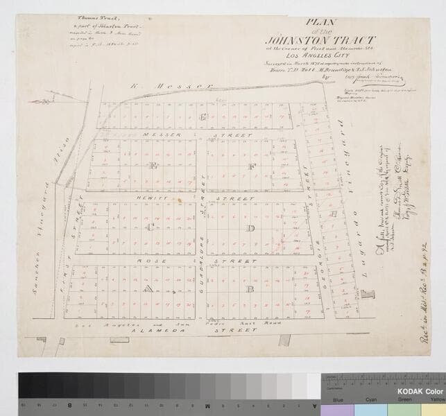 Corner of First and Alameda Street . Alameda to Messer St., First to Georgia (Garey) St.. This is half size of the original map.. Surveyed at the request of T.D. Mott, M. Brundige & A.J. Johnston. Vineyards adjacent on north & south [?]ends. Structures indicated on Alameda St.; lots numbered in red ink; Thomas Tract part of Johnston Tract note. Alt. title supplied by cataloger.