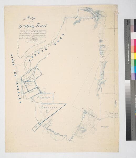 Dr. John S. Griffin & J.C. Welsh. Entire northeastern quarter of City of Los Angeles, showing surface detail, structures, and names of parcel owners. Fine hachures, color highlights; LA River, Arroyo Seco; Willhart, Moulten, Ruiz, Charis parcels. . Alt title supplied by cataloger.
