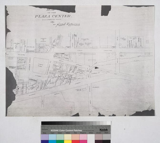 Map of the old portion of the city surrounding the plaza, showing the old plaza church, public square, the first gas Plant and adobe buildings