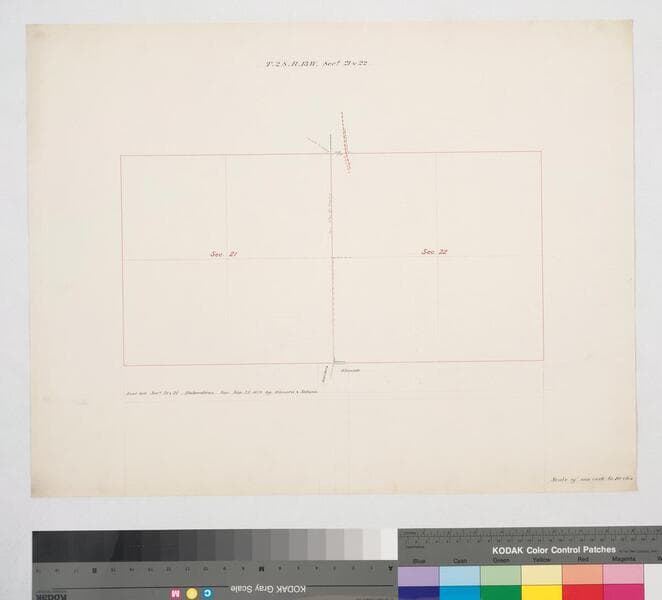 On printed township grid with names of parcel owners, in sec. 3-11, 20, 29, 31. Red & black ink. Notations on surveying history. Title supplied by cataloger.