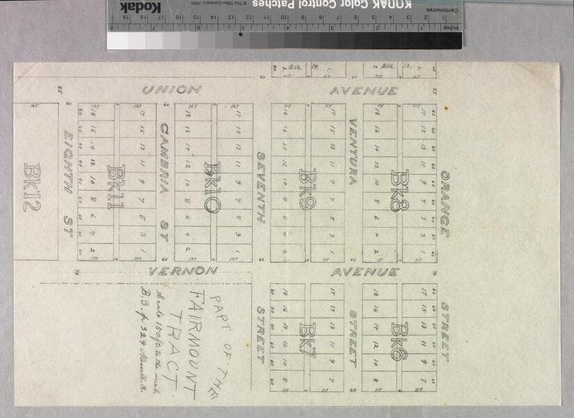along Vernon Ave. and Whittier St. from Sixth (i.e., Seventh) to Ninth St., Lot 7 Block 37, Hancock's Survey. Color highlighting; tract numbers, owners indicated; lot sizes & acreage indicated on some. Alt. title supplied by cataloger.