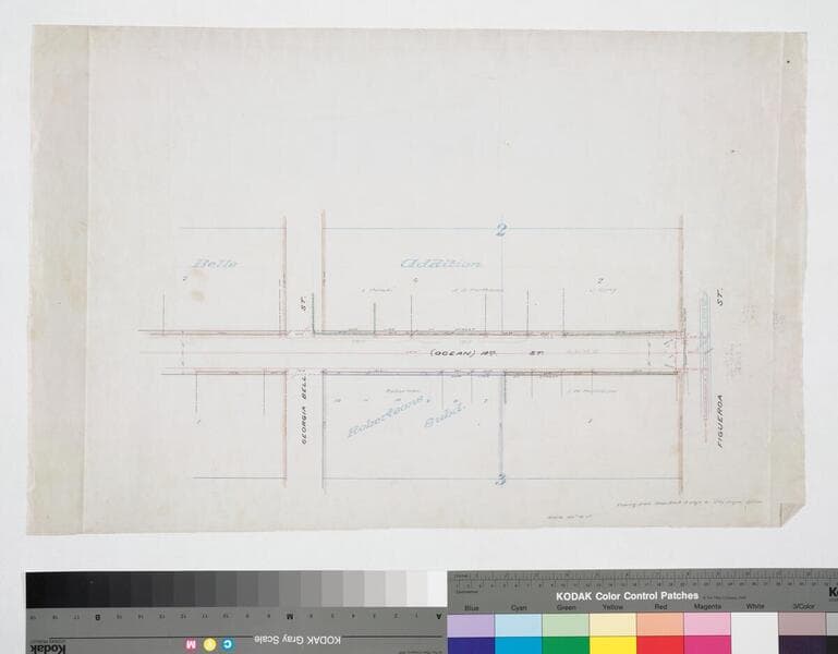 Figueroa to Georgia Bell St. from Montgomery to Ocean St., subdivision of Lot 8 Block B of Hancock's Survey. Red, blue, black ink; fences, hedges; courses, distances, lot numbers indicated; pencil calculations. Title supplied by cataloger.