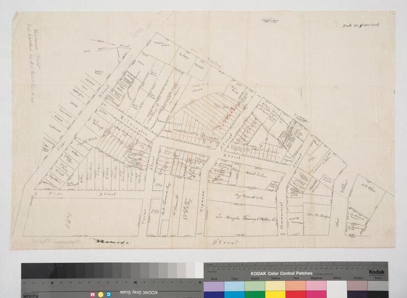 Old Aliso, Centre, Ramirez, Howard Sts. Shows lot owners, bearings, distances. Black & red ink, color highlighting. Verso: Ballestero Vineyard. Alt title supplied by cataloger.