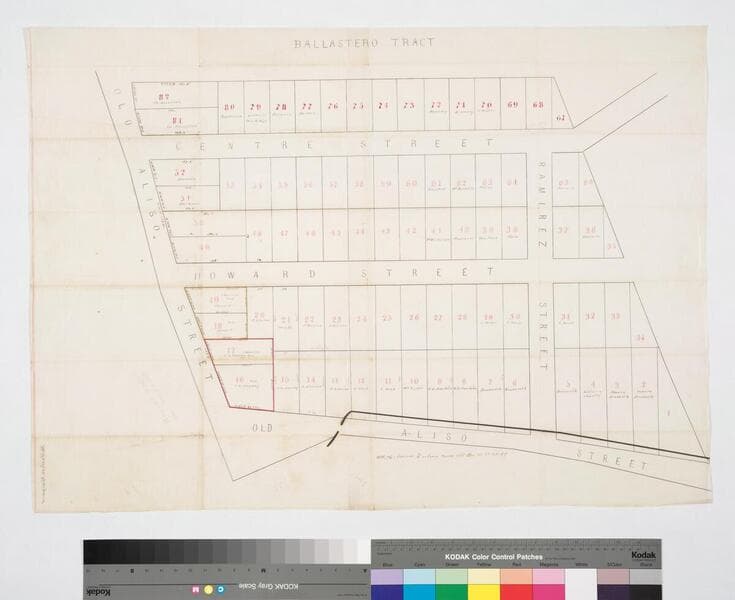 Los Angeles to Alameda St., Aliso to First St.; shows lot owners, distances; black, red ink. Solano-Reeve stamp. Alt title supplied by cataloger.