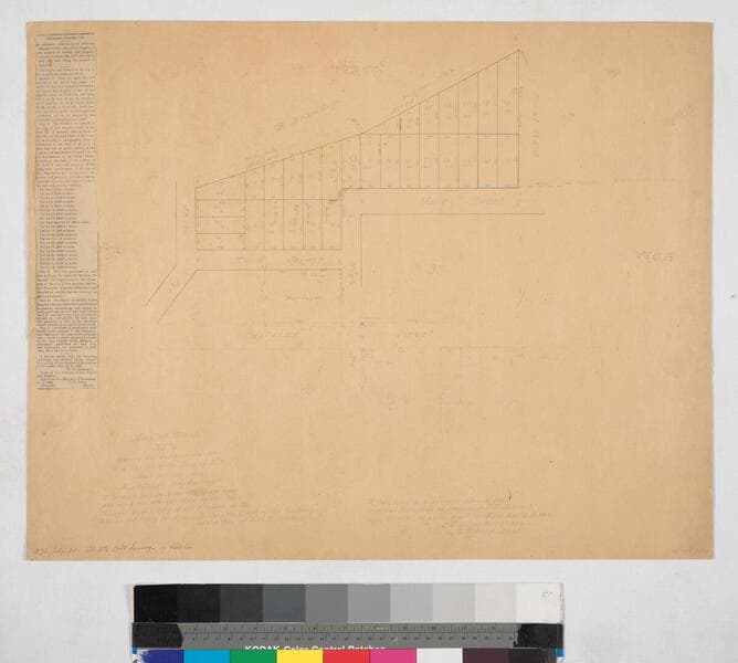 Main to Spring St. from Sixth to Seventh St., showing structures, frontages, lot owners including Geo. Hansen; pencil calculations. Affixed: description of 15 ft. alley in two 6 x 8 3/4 in. sheets. Extensive manuscript notations and additions.. Alt title supplied by cataloger.