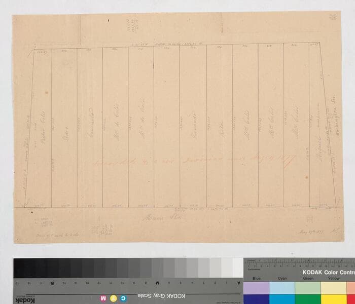 Northeast of Main & Washington St., Subdivision of partition of Aug. 4th 1877 per Pedro de Celis et al vs. Pastor de Celis. Parcels are numbered (red & black ink) with owners indicated; distances, acreage. Pencil notations & calculations. Alt title supplied by cataloger.
